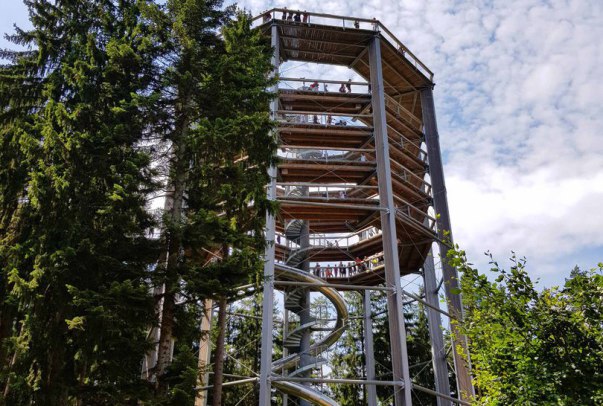 Der 40 Meter hohe Turm ist das ideale Ausflugsziel für Erwachsene und Kinder. Der Eintritt kostet umgerechnet ungefähr ca. 10 EUR. Jeder kann viel erfahren über die Natur, den Wald und seine Bewohner. Oben am Gipfel angekommen, könnt ihr euch entscheiden, ob ihr den ganzen Weg wieder herunterlaufen oder mit der 52 Meter langen Rutsche für umgerechnet 2 EUR herunterrutschen wollt. Ich habe das selbst gemacht und kann es empfehlen – aber keine Angst, es ist nicht so rasant wie es vielleicht aussieht.